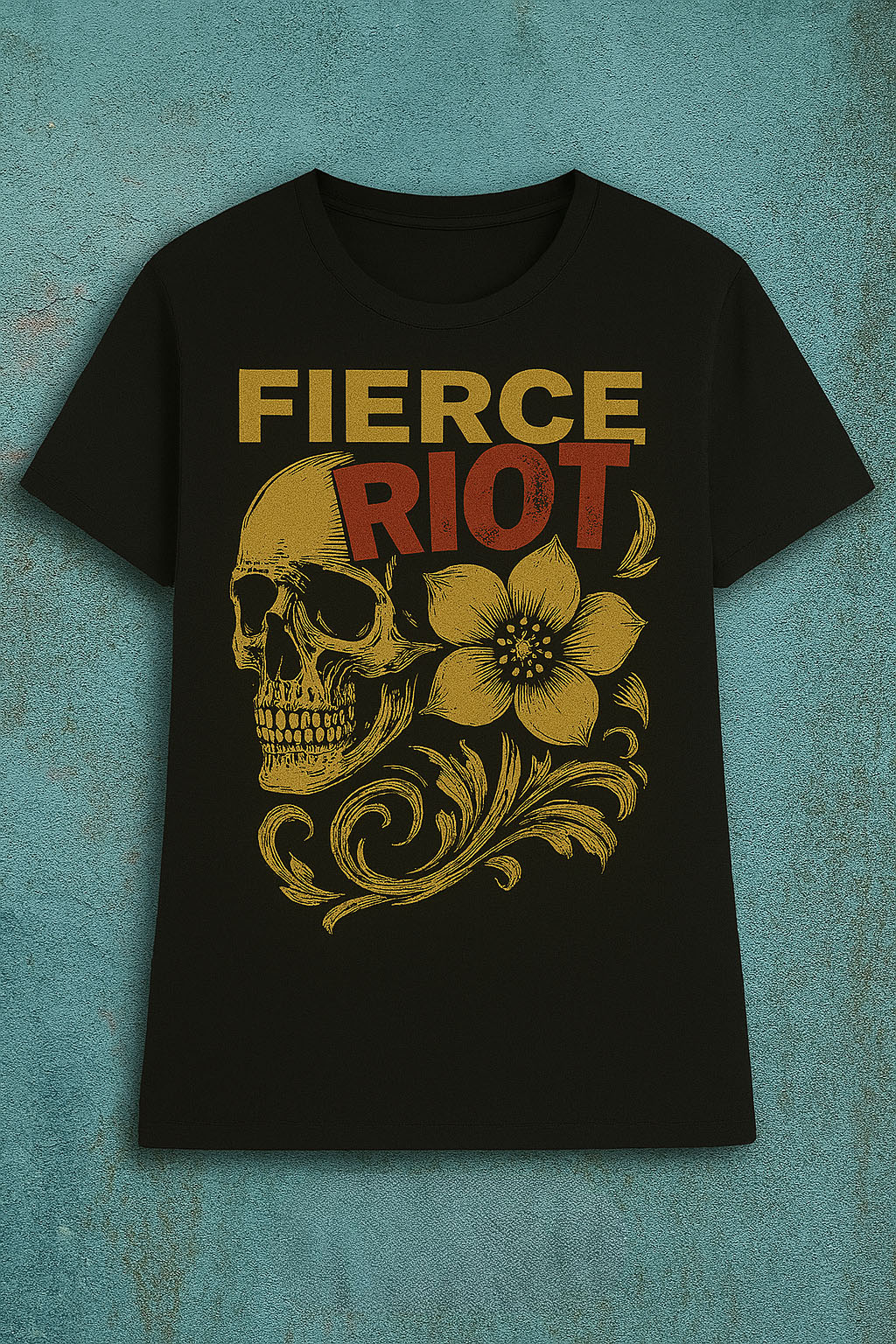 Deze tee laat zien dat je niet hoeft te kiezen tussen vrouwelijk en rauw. De gouden florals botsen heerlijk met de schedelprint, en “RIOT” schreeuwt in knalrood precies waar we voor staan: stijl met een stem.