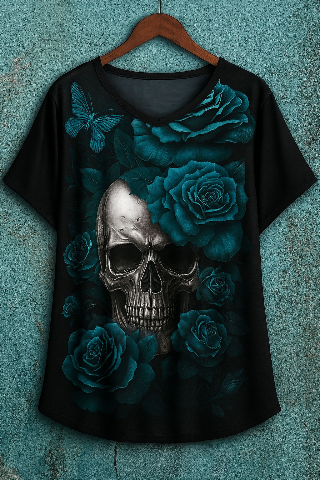Deze zwarte tee knalt met een iconische schedelprint tussen diepblauwe rozen en een dromerige vlinder – een ode aan contrasten. Zacht én rauw. Femme én fearlessly bold.